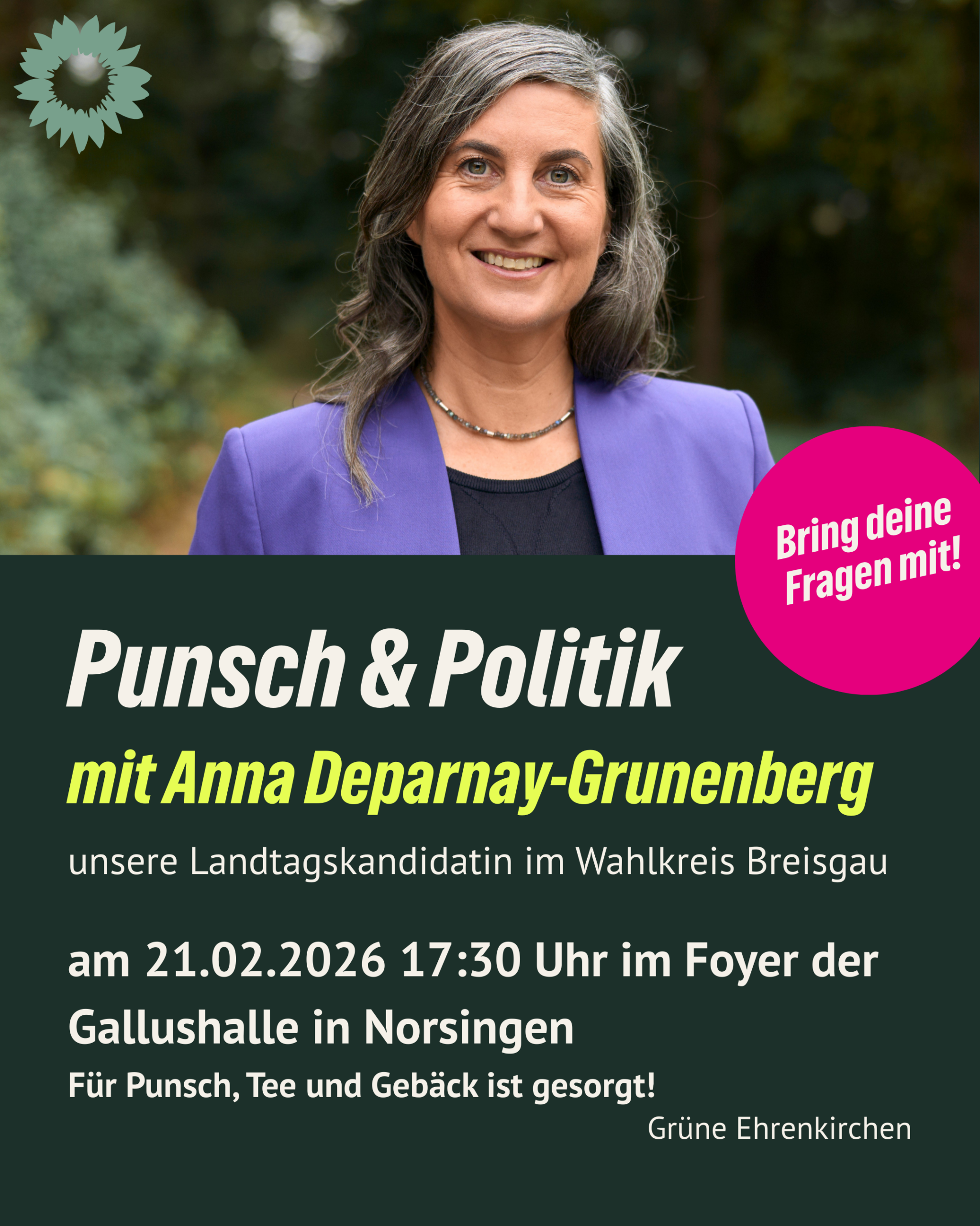 Die Grüne Ehrenkirchen bieten für Interessierte „Punsch & Politik“ an mit Landtagskandidatin für den Wahlkreis Breisgau, Anna Deparnay-Grunenberg. Am 21.02.2026 17:30 Uhr im Foyer der Gallushalle in Norsingen
